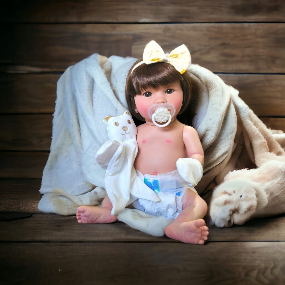 Essa fofura possui detalhes de pintura por todo rosto, membros e corpo. Seus olhos e cabelinho castanho farão qualquer um se encantar. O seu novo modelo favorito apresenta enxoval delicado, incluindo: