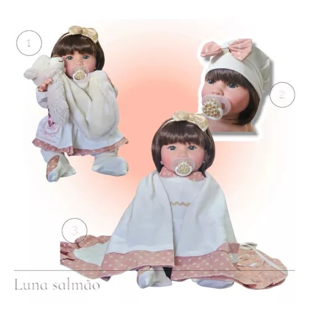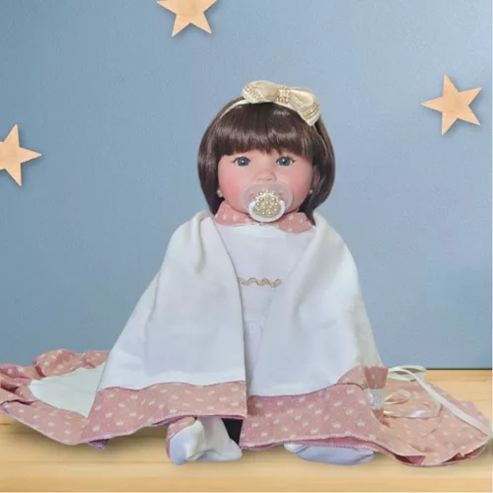 Essa fofura possui detalhes de pintura por todo rosto, membros e corpo. Seus olhinhos azuis e seu cabelinho castanho farão qualquer um se encantar. O seu novo modelo favorito apresenta enxoval delicado, incluindo: